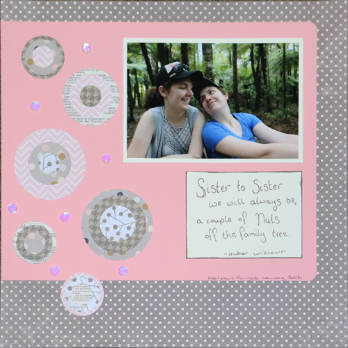 I also used some sequins to add a little sparkle to this layout. For the title/journaling I jumped onto Pinterest to find some 'sister' quotes. I found about 8 quotes and then took them to my daughters and had them choose the one they felt was the most like them and would go with the layout.